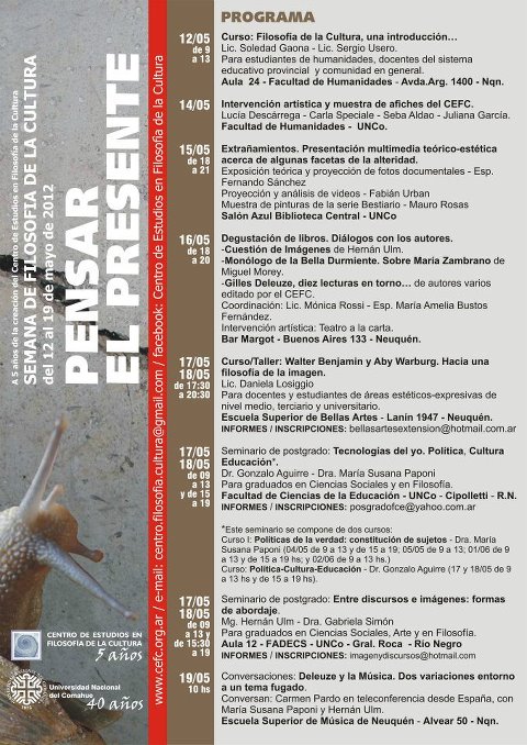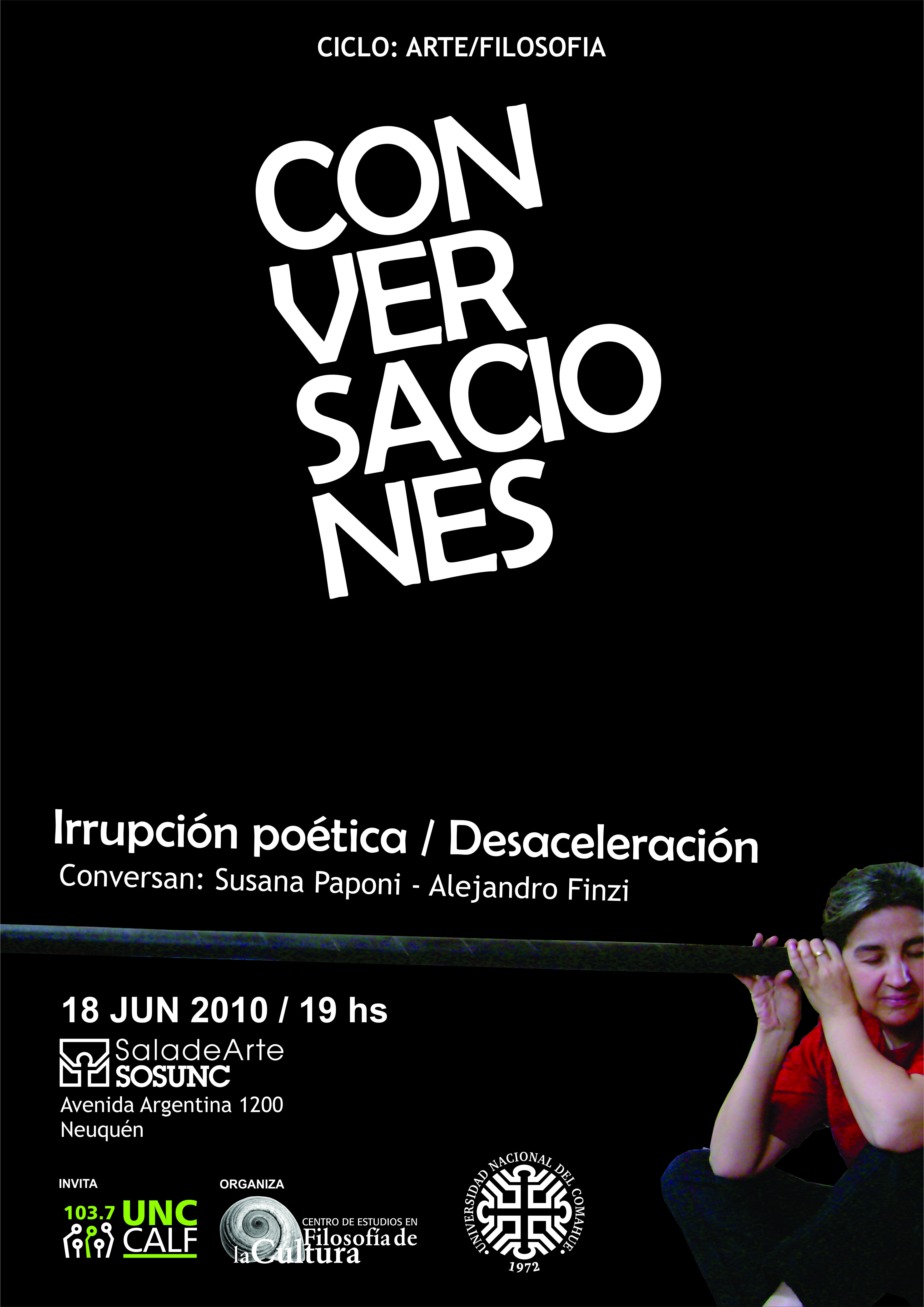 Cinco encuentros realizados en la ciudad de Neuquén durante 2009 y 2010, en los que se exploraban los cruces entre conceptos filosóficos y diversos modos de expresión y experiencia.